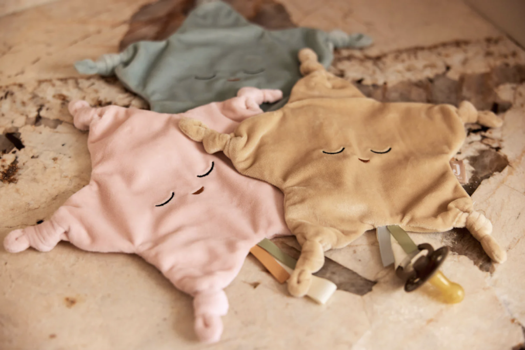 Jollein comfort blankets are made from soft materials like teddy fabric and velour, perfect for snuggling and holding close. Many designs also include small tags, buttons, or rattles that stimulate the senses and help develop fine motor skills. How cute is the Little Star Pacifier cloth?