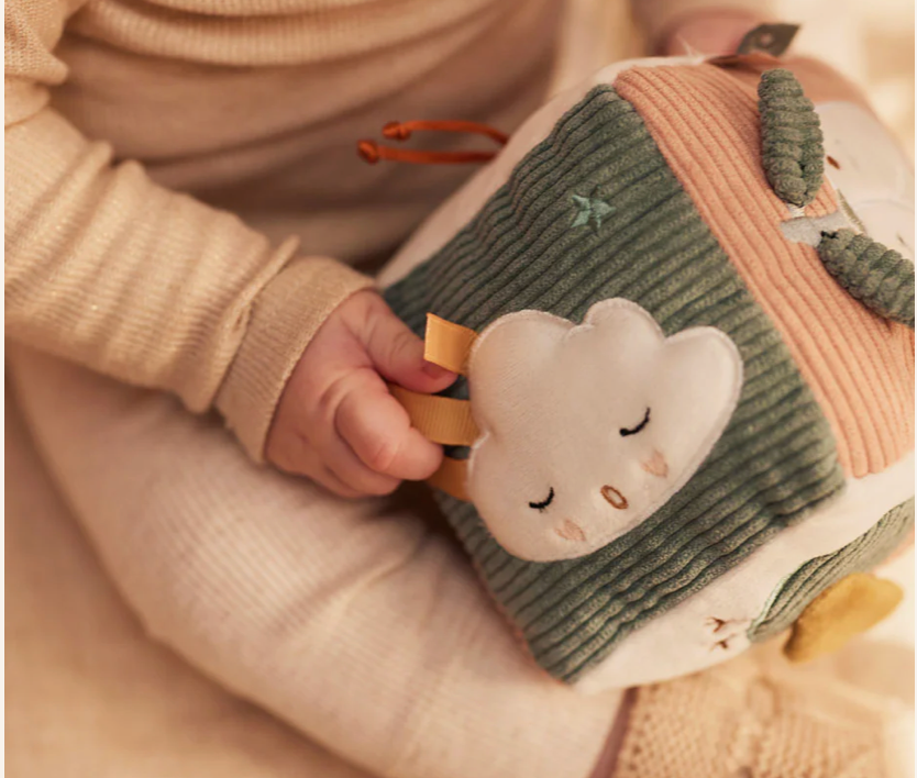 Later in the first year, an activity cube is a wonderful next step: a block full of textures, shapes, and sounds that keeps your baby engaged and learning. TheActivity Cube Flower Fairies or On the Go are the perfect examples – educational, safe, and fun for the second half of the first year.